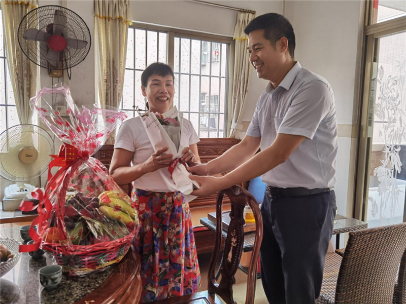 每到一戶,南頭鎮(zhèn)退役軍人服務中心主任黃國全都為“兵媽媽”獻上鮮花和果籃,并了解邊防海防現(xiàn)役軍人在部隊的服役情況,以及家屬身體狀況、生活、工作等情況,對她們默默支持孩子為國防建設作貢獻致以崇高的敬意。