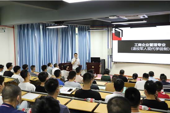 “狹路相逢勇者勝,在座的各位從繁忙的工作崗位上走出來,邁出繼續(xù)學(xué)習(xí)的關(guān)鍵一步,勇氣可嘉。三年后,相信大家一定會(huì)收獲知識(shí)、技能、學(xué)歷,更好地開啟新征程?!蓖艘圮娙爽F(xiàn)代學(xué)徒制項(xiàng)目開學(xué)典禮上,經(jīng)管學(xué)院院長(zhǎng)肖紅在致辭中對(duì)新生們表示歡迎和祝賀,并表達(dá)了殷切期望,希望大家在求學(xué)期間,修德修身、克勤克儉、心懷理想,腳踏實(shí)地,融入多姿多彩的校園生活,在學(xué)生當(dāng)中彰顯軍人本色和榜樣力量。 市退役軍人事務(wù)局相關(guān)負(fù)責(zé)人對(duì)項(xiàng)目順利開班表示祝賀,對(duì)學(xué)院在項(xiàng)目申報(bào)、招生等工作中的辛勤付出表示衷心感謝。他介紹了項(xiàng)目實(shí)施的背景,指出開展退役軍人現(xiàn)代學(xué)徒制教育,是退役軍人安置工作的一項(xiàng)重要內(nèi)容,通過現(xiàn)代學(xué)徒制,讓大家成為全日制大學(xué)生,進(jìn)行正規(guī)系統(tǒng)的高等職業(yè)教育,是黨和政府送給同學(xué)們的一份沉甸甸的“大禮包”。同時(shí),要求新生們盡快適應(yīng)由士兵到大學(xué)生的角色轉(zhuǎn)變,勤學(xué)善思,掌握就業(yè)創(chuàng)業(yè)本領(lǐng),發(fā)揚(yáng)軍隊(duì)能打勝仗的優(yōu)良傳統(tǒng),爭(zhēng)創(chuàng)佳績(jī),為祖國(guó)和地方經(jīng)濟(jì)建設(shè)再立新功。 學(xué)院工商管理專業(yè)主任沈孟康介紹了學(xué)校和學(xué)院概況,就學(xué)生日常管理、教學(xué)內(nèi)容、方式和計(jì)劃等作詳細(xì)說明。表示學(xué)校將采取在崗培養(yǎng)與學(xué)校培養(yǎng)相結(jié)合,堅(jiān)持“標(biāo)準(zhǔn)不降、模式多元、學(xué)制靈活”,線上與線下混合教學(xué),實(shí)行工學(xué)交替、靈活多元的教學(xué)模式。經(jīng)管學(xué)院已配備了教授、博士等“精銳”師資團(tuán),“量身定制”人才培養(yǎng)方案,全力保障“八一班”的教育教學(xué)質(zhì)量。