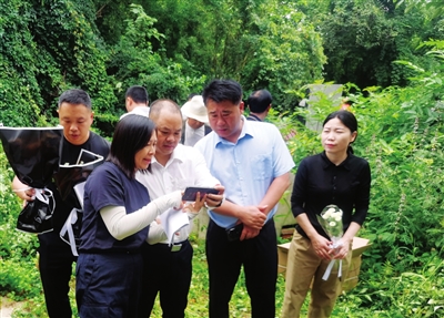 市退役軍人事務(wù)局負(fù)責(zé)人向荊門市退役軍人事務(wù)局有關(guān)人士了解甘和順烈士墓的保護(hù)情況。通訊員供圖