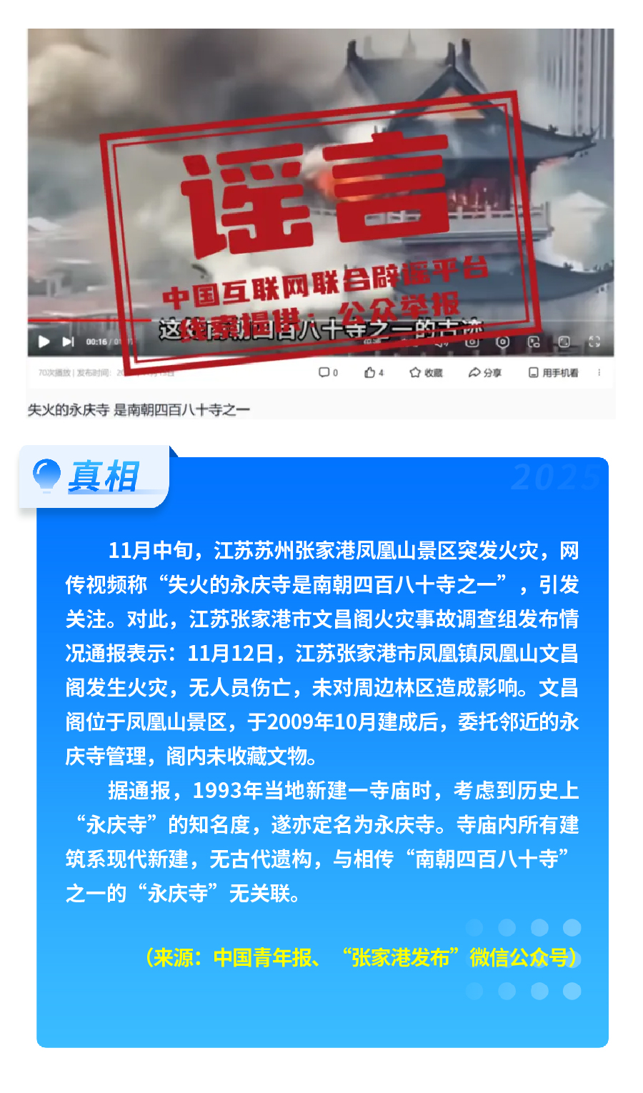 社會熱點(diǎn)事件被歪曲蹭炒。首屆“蘇超”聯(lián)賽泰州隊(duì)奪冠后,“冠軍獲五十萬獎金、城市地圖放大字號”等謠言流傳,以夸張信息博眼球、引流量;江蘇張家港鳳凰山景區(qū)火災(zāi)后,“‘南朝四百八十寺之一’被燒”的謠言引發(fā)熱議,通報(bào)顯示失火建筑為2009年新建,與歷史上的南朝寺廟無關(guān)聯(lián)。