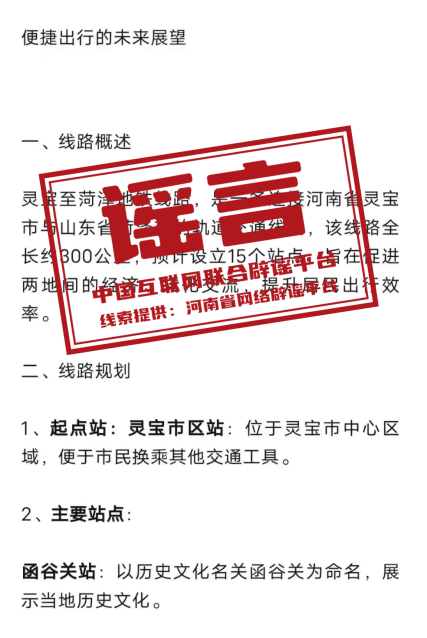 真相:近日,有自媒體賬號(hào)在互聯(lián)網(wǎng)平臺(tái)發(fā)布“靈寶到菏澤的地鐵”相關(guān)信息,稱“該線路全長(zhǎng)約300公里,預(yù)計(jì)設(shè)立15個(gè)站點(diǎn)”“起點(diǎn)站為靈寶市區(qū)站,位于靈寶市中心區(qū)域”,引發(fā)關(guān)注。經(jīng)核實(shí),該消息系虛假信息?;ヂ?lián)網(wǎng)不是法外之地,請(qǐng)自覺(jué)遵守法律法規(guī),不造謠、不信謠、不傳謠。(來(lái)源:“清朗河南”微信公眾號(hào)、網(wǎng)信靈寶)
