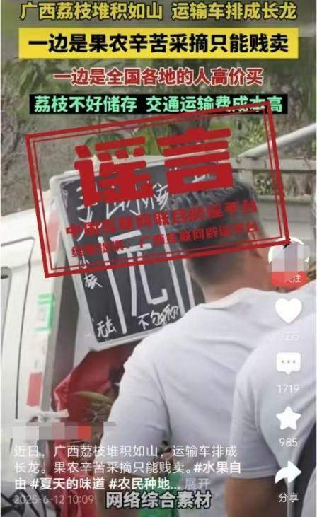 真相:6月12日,網(wǎng)傳“近日廣西荔枝堆積如山,運輸車排成長龍。果農(nóng)辛苦采摘只能賤賣”的視頻,畫面顯示荔枝堆積和“靈山荔枝1元”字樣。經(jīng)核查,視頻內(nèi)容并非發(fā)生在靈山縣。目前,靈山荔枝“妃子笑”等中熟品種逐漸批量上市,大規(guī)模上市時間為6月20日左右,當(dāng)前荔枝產(chǎn)銷有序開展,并未發(fā)現(xiàn)個別媒體報道的“荔枝滯銷賤賣”“采摘堆積成山”“運輸車排成長龍”的情況,也沒有發(fā)現(xiàn)價格低到1元的荔枝出售。(來源:“廣西互聯(lián)網(wǎng)違法和不良信息舉報”微信公眾號)