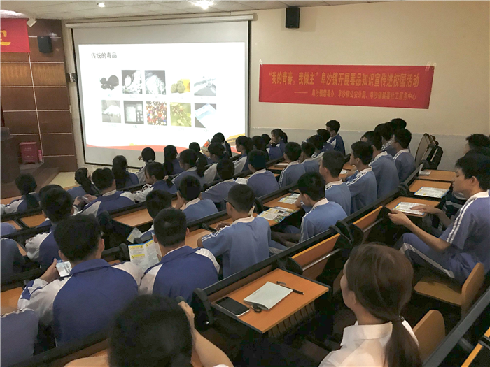 活動現(xiàn)場,鎮(zhèn)禁毒辦專干和禁毒社工通過派發(fā)宣傳單張、介紹仿真毒品模型、講解禁毒PPT、口號宣誓、有獎問答等方式向學生們普及禁毒防毒知識,力求從根源上打造無毒校園。