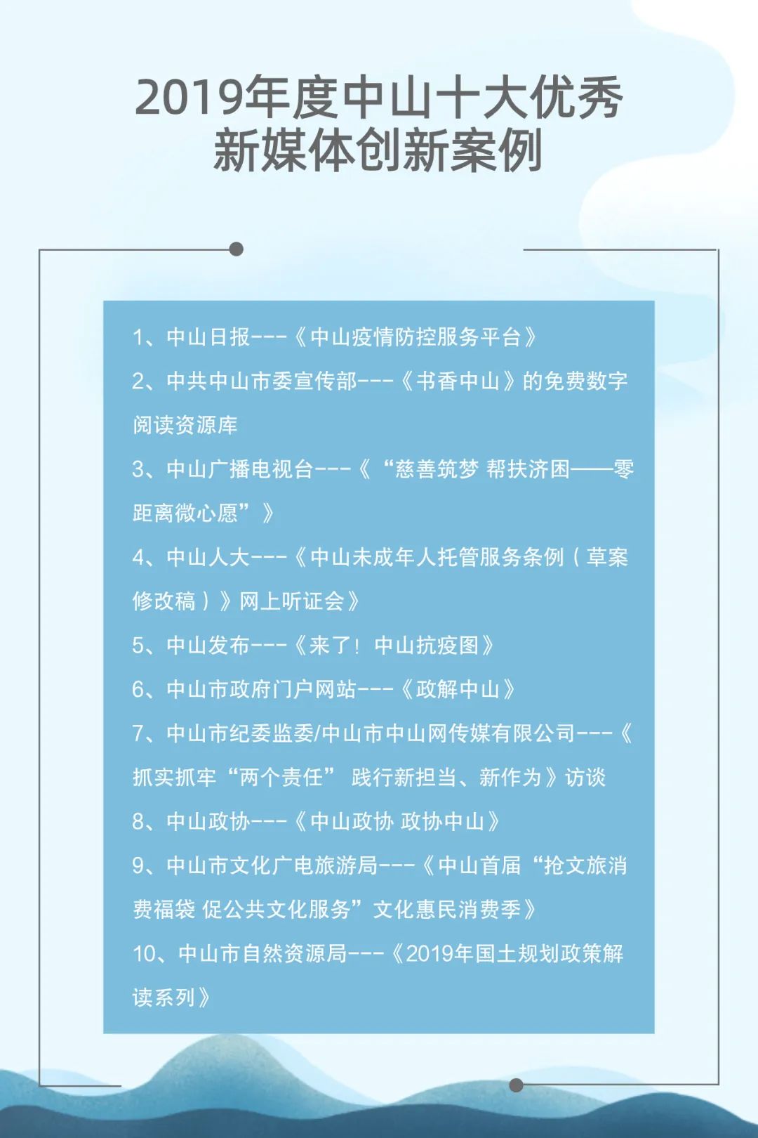 自2015年起,中山市網(wǎng)絡(luò)文化協(xié)會聯(lián)合中山日報報業(yè)集團(tuán)、人民網(wǎng)輿情數(shù)據(jù)中心已連續(xù)成功舉辦了四屆中山新媒體影響力年度排行榜發(fā)布會。與此同時,自2017年起,中山廣播電視臺聯(lián)合新榜(上??窗裥畔⒖萍加邢薰荆┮惨呀?jīng)連續(xù)成功舉辦了三屆中山市新媒體頒獎盛典。兩個評選活動通過立標(biāo)桿、樹典型,有效促進(jìn)了中山新媒體的建設(shè)運(yùn)營水平,推動了中山新媒體的健康向上發(fā)展。